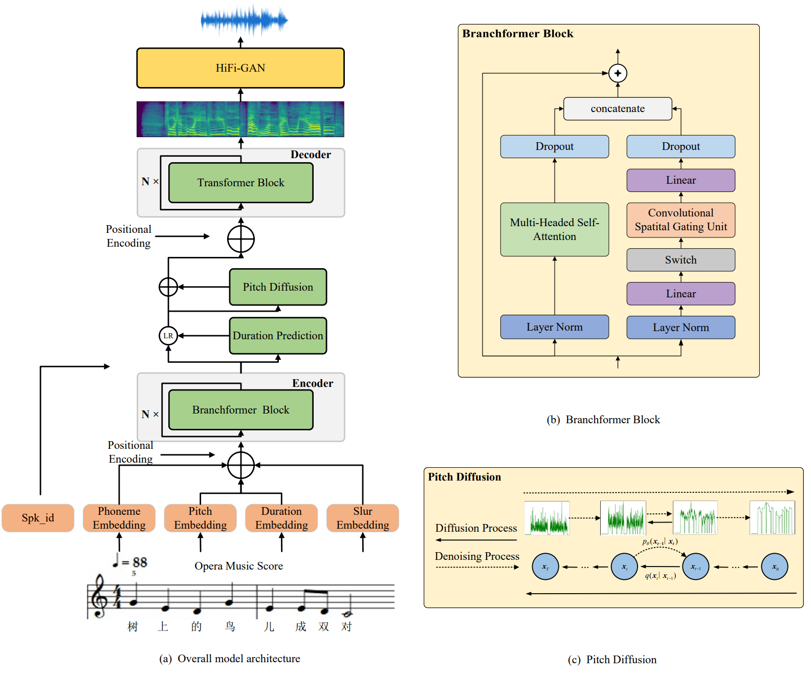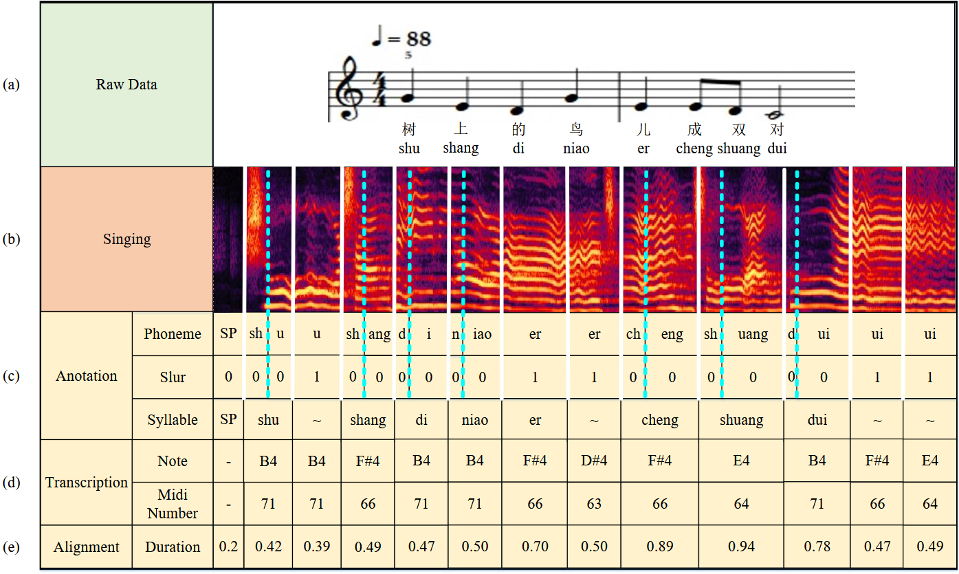 Model ArchitectureThe Dataset Overview. (a) The original sheet music. (b) The singing recording results. (c) The annotation results. The white bold lines indicate syllable boundaries, and the colored dotted lines indicate the boundaries of phonemes in each syllable. Slur stands for continuous sound. (d) The transcription result from pitch to notes and MIDI numbers. (e) The duration result after the alignment process.